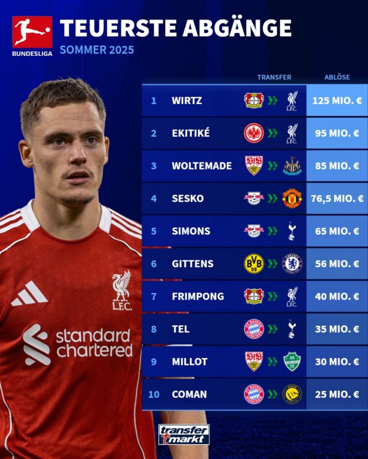 德甲夏季转会窗口已于9月4日正式关闭,权威数据平台《转会市场》随即公布了今夏联赛出售球员身价排行榜,其中维尔茨以压倒性身价独占鳌头。