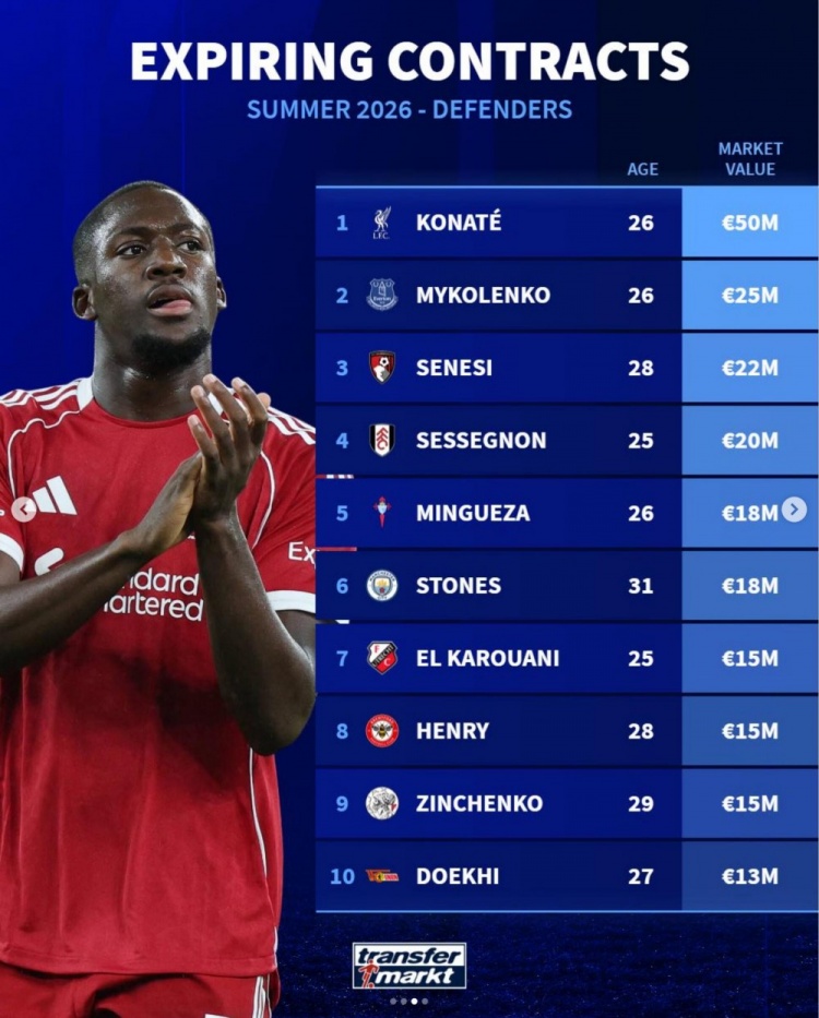 开云体育入口-德转列今夏合同到期十大后卫球员身价,科纳特5000万欧居首
